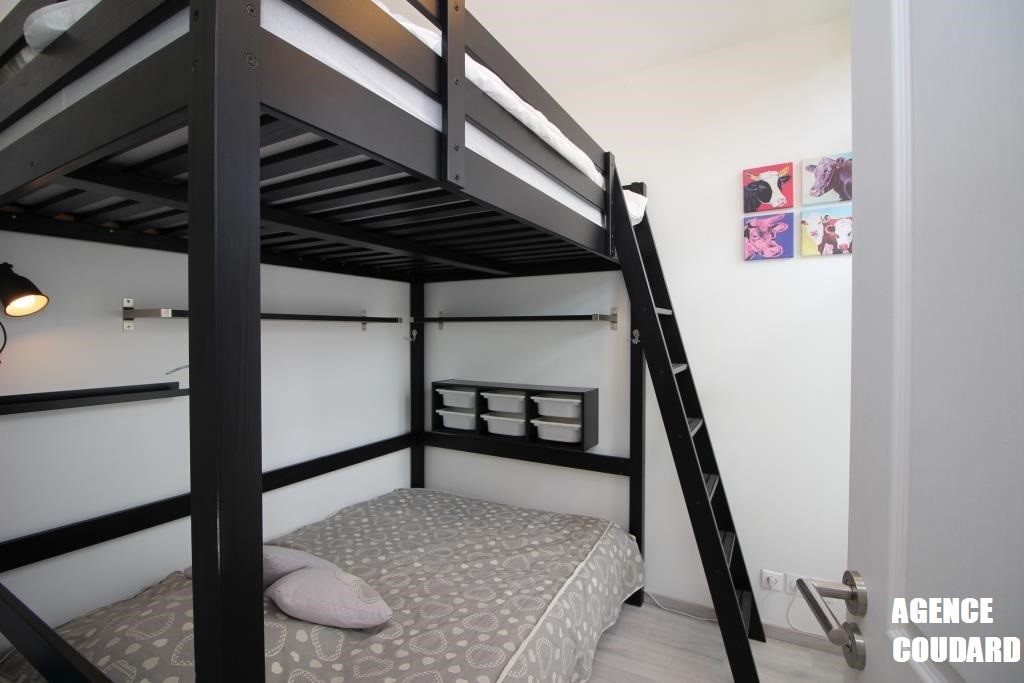 Une seconde chambre avec un lit 140 en mezzanine éclairée par une porte fenêtre.