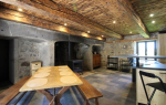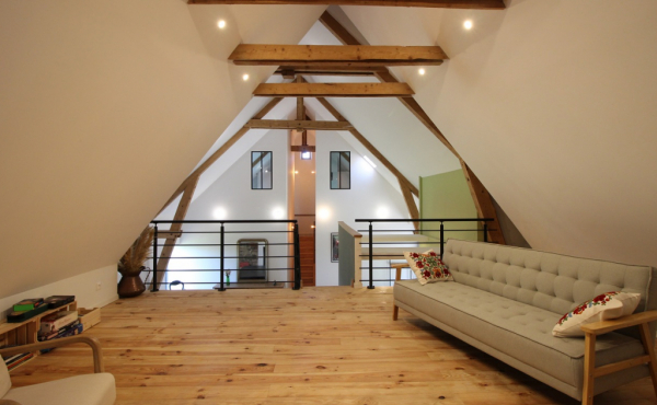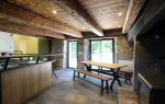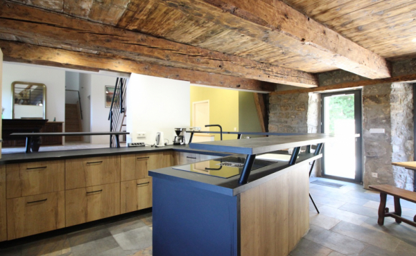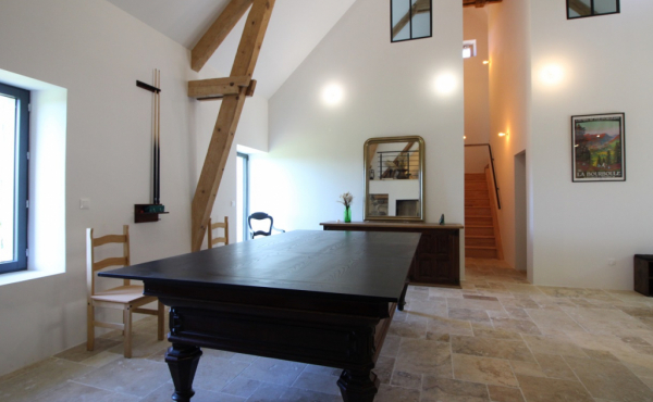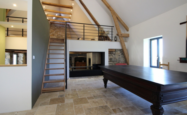 un espaces repas avec poêle à bois, une cuisine US totalement équipée avec table induction 4 zones intégrant un systéme d'aspiration, four, micro-ondes, réfrigérateur/congélateur, lave-vaisselle ... Un séjour équipé d'un billard français. En mezzanine, un espace salon avec canapé convertible en couchage 2 personnes 217x150.