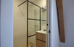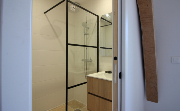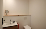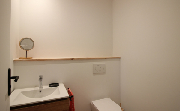 Une salle d'eau (douche) équipée d'un séche-serviettes, deux toilettes indépendants, un espace banderie avec lave-linge et séche-linge.