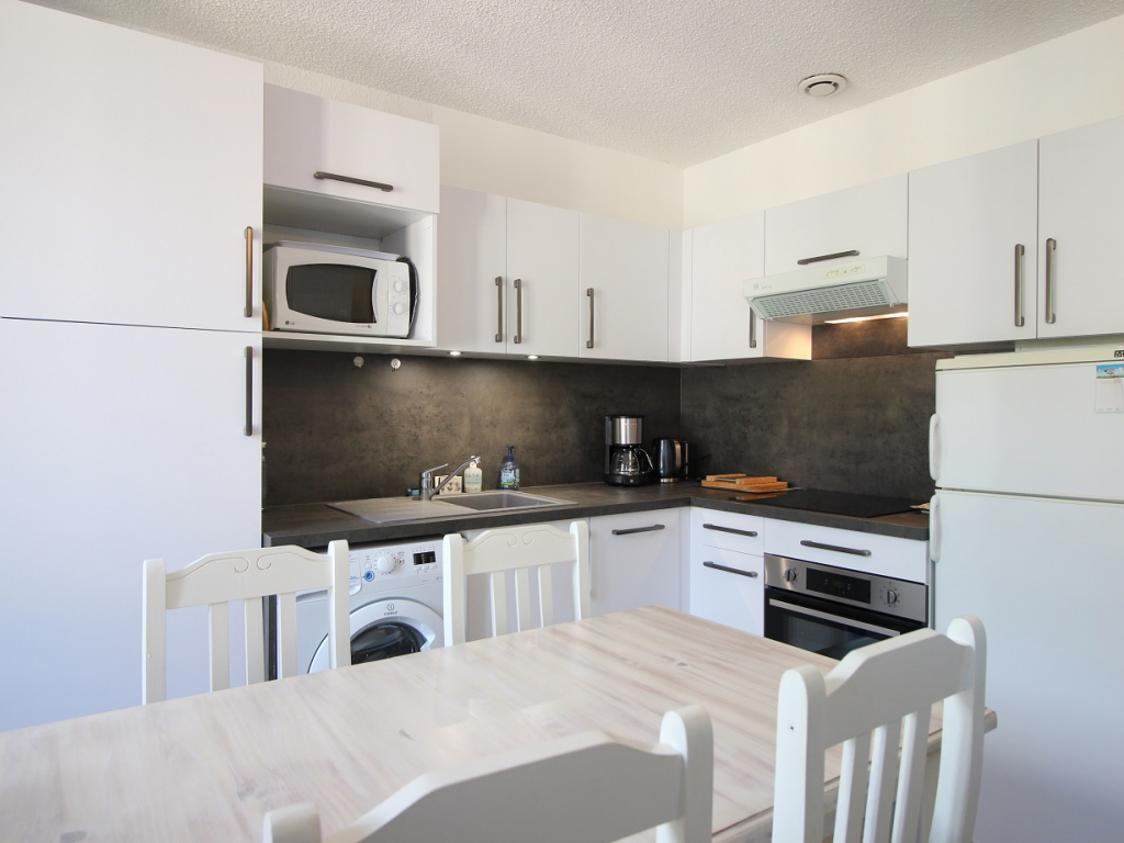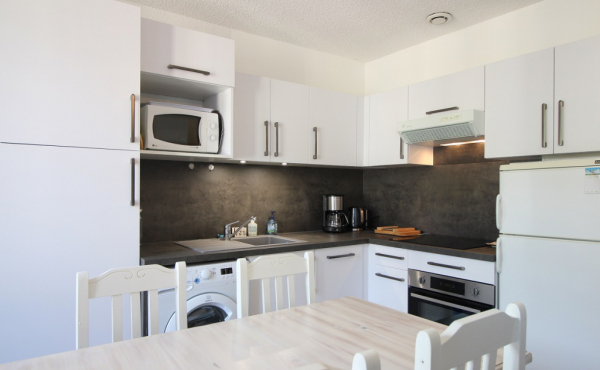 Cuisine US avec plaque induction 3 zones, hotte, four, micro-ondes, réfrigérateur grand modèle avec congélateur, lave-vaisselle, lave-linge ...