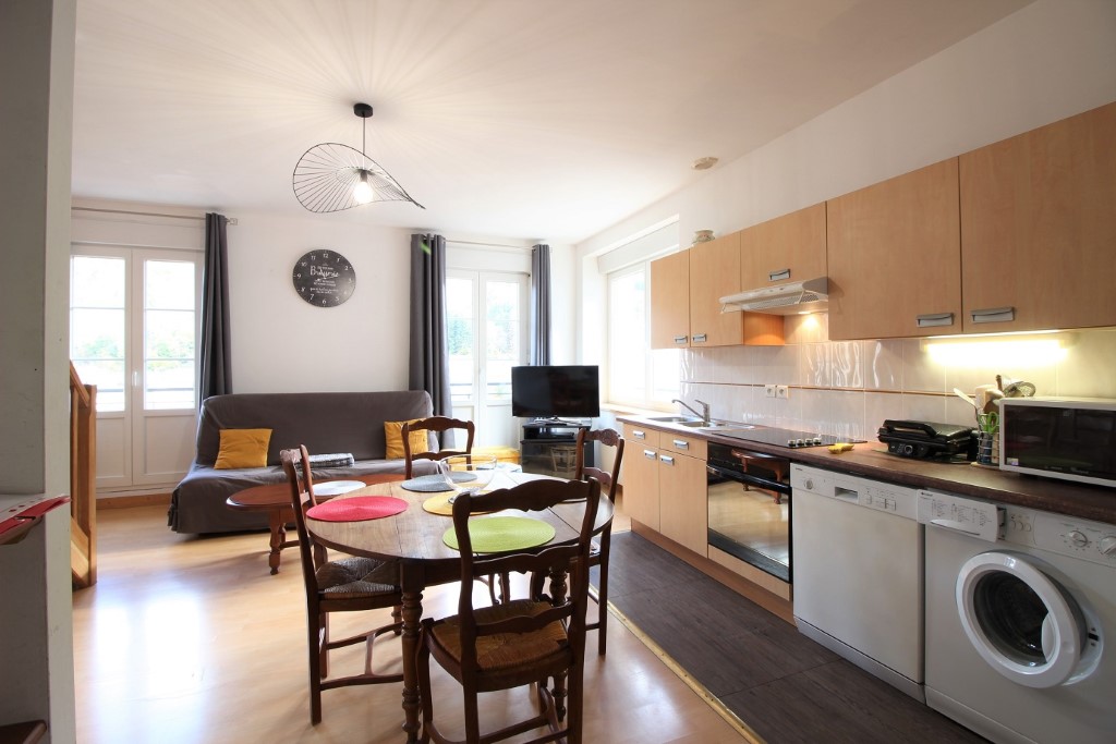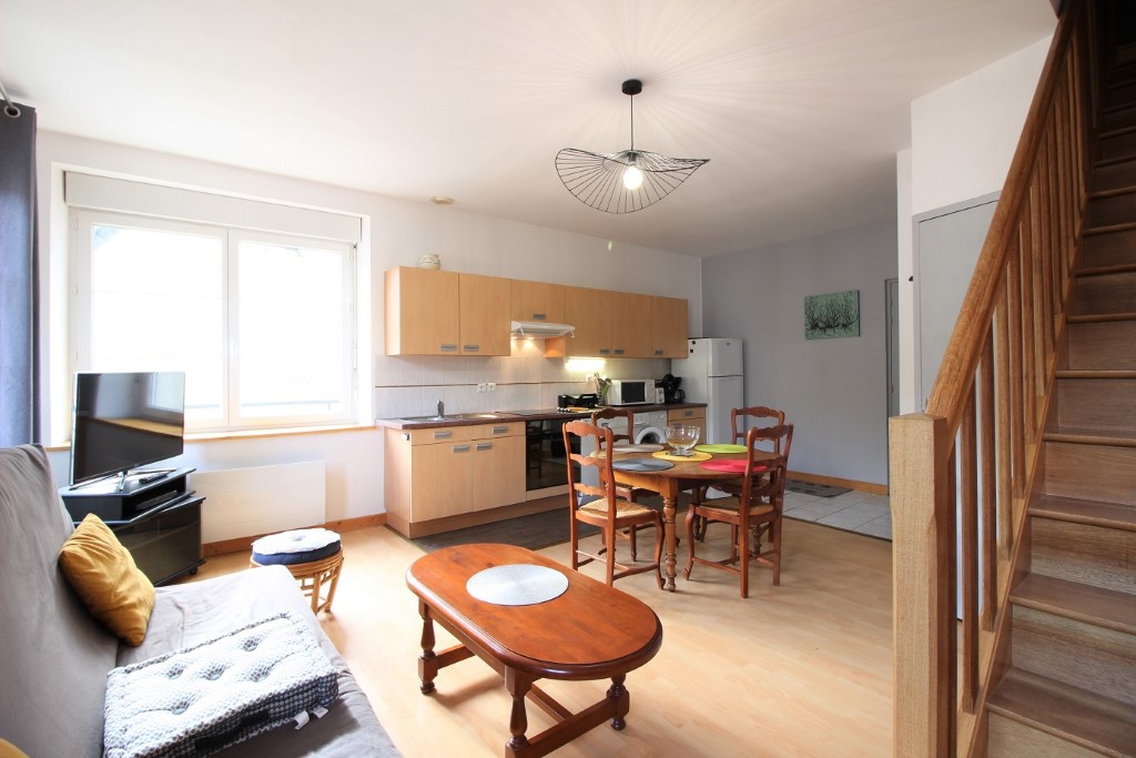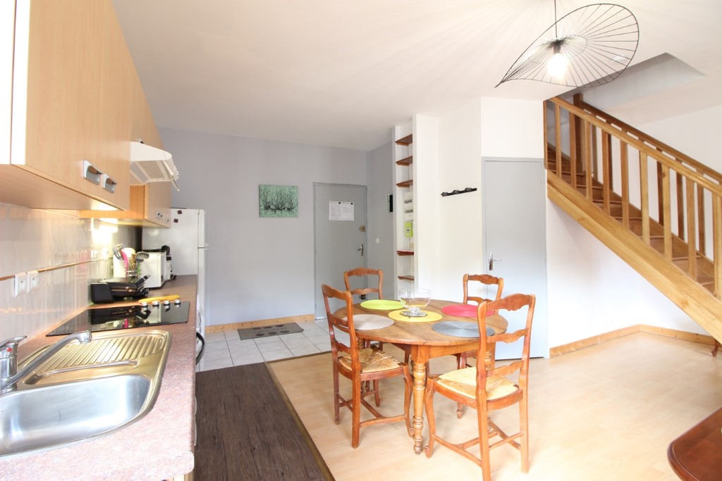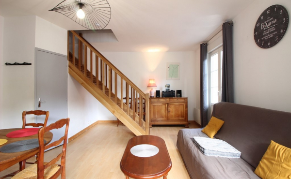 Il se compose au premier niveau, d'une pièce à vivre combinant séjour, cuisine US et salle à manger, le tout exposé EST et bénéficiant d'une vue dégagée sur la ville. Cette première pièce dispose d'un canapé convertible en lit deux personnes. Toujours au même niveau, une salle d'eau avec douche et WC.