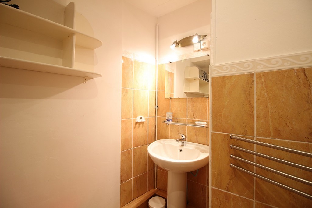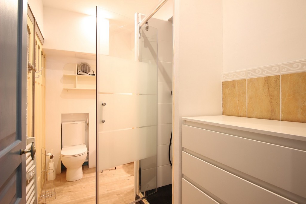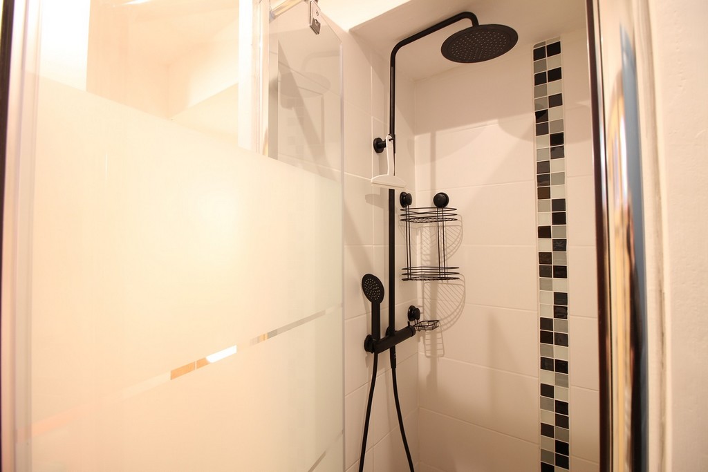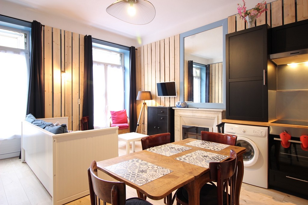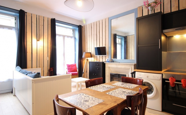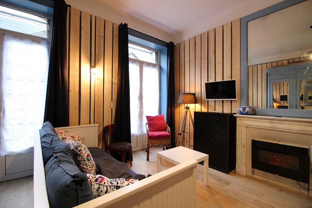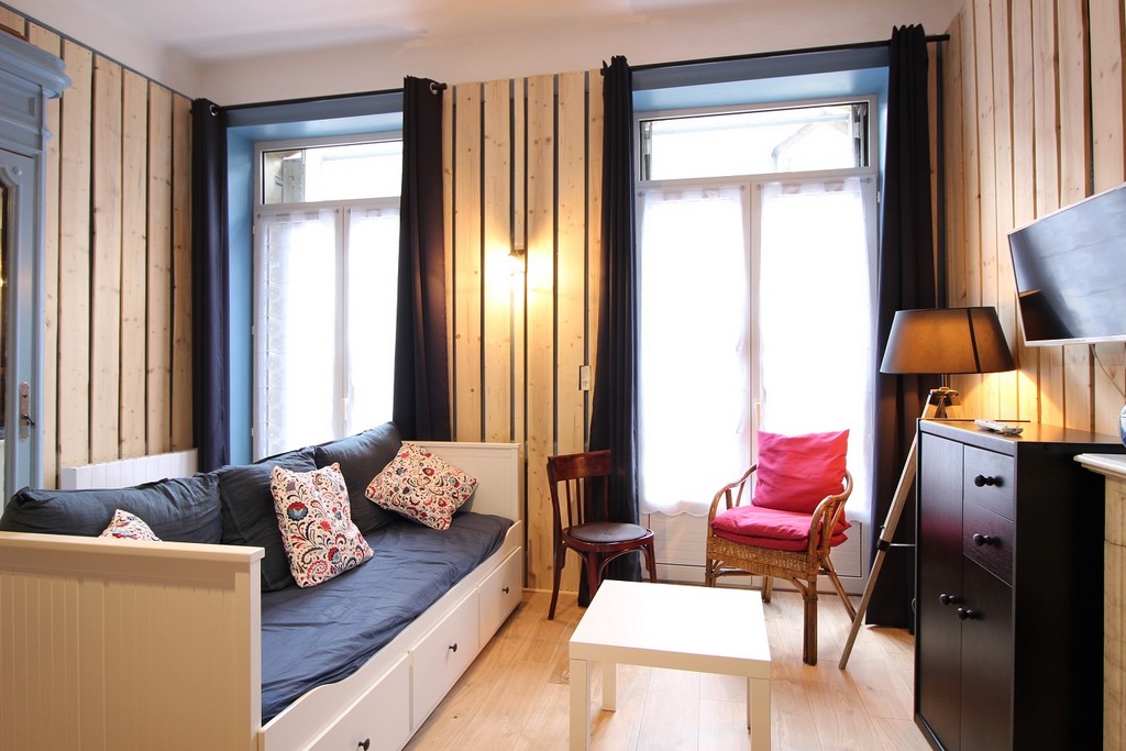 une agréable pièce à vivre équipée d'un canapé convertible et bénéficiant de nombreux rangements,