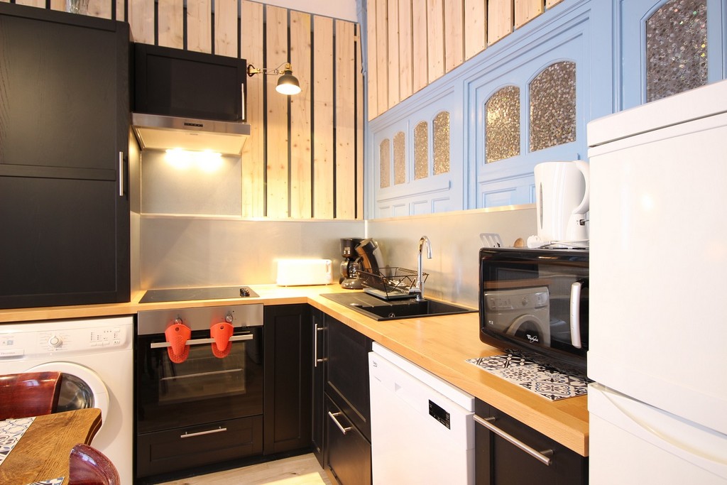 cuisine us totalement équipée avec plaque vitrocéramique 3 zones, four, hotte, micro-ondes, réfrigérateur GM avec congélateur, lave-vaisselle, lave-linge ...,