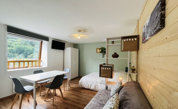 La pièce à vivre dispose d'un canapé transformable en petit lit double (120x185) et d'un coin nuit avec un lit double (140x190).