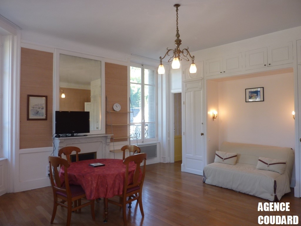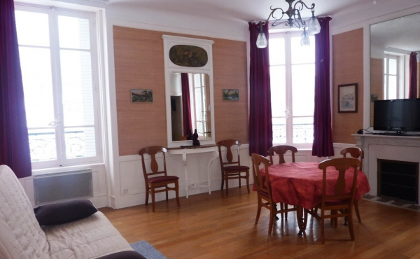 Grand hall avec placard, vaste séjour parquet en rotonde très lumineux avec vue sur le Casino et le Parc, 1 banquette lit 2 personnes et 1 BZ 2 personnes, télévision écran plat,