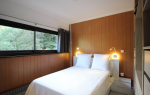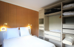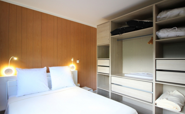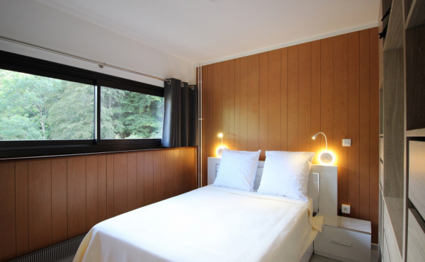 Une chambre lit 140 bénéficiant d'un bel espace rangements et équipée de rideaux occultants,