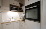 Une cuisine équipée avec plaque 2 zones induction, hotte, réfrigérateur Top avec espace congélateur, four, micro-ondes ...
