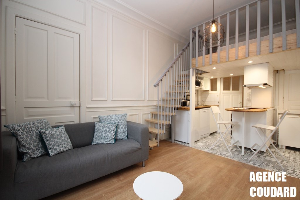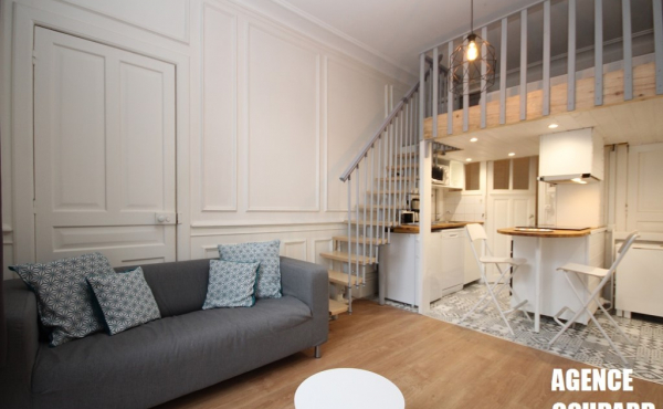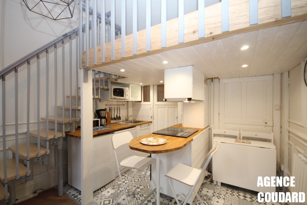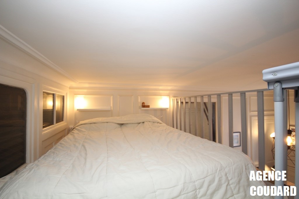 Il se compose d'une entrée, une pièce à vivre avec cuisine US équipée (1.80m de hauteur sous-plafond), une mezzanine surplombe la pièce à vivre et offre un premier coin nuit (couchage double en 140, très bas de plafond et plus adapté aux enfants).