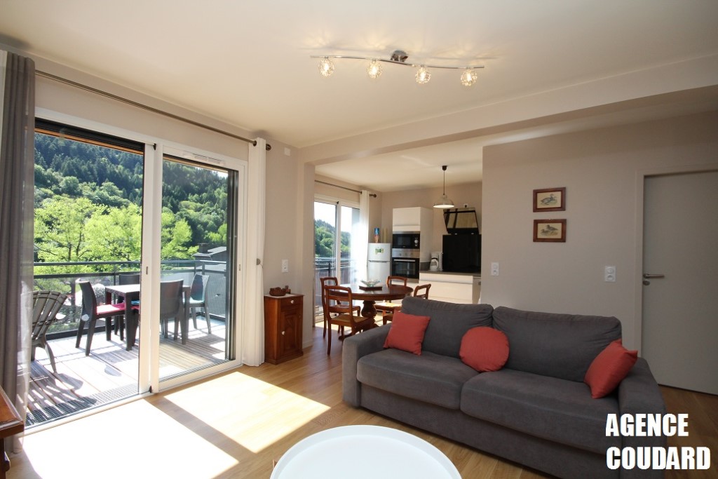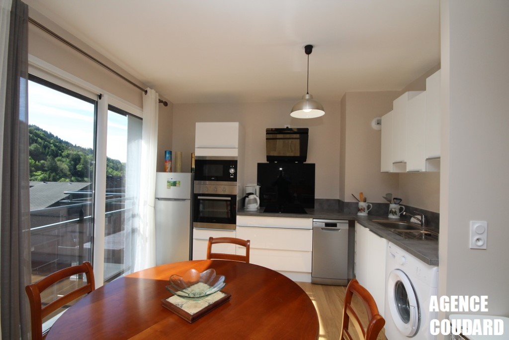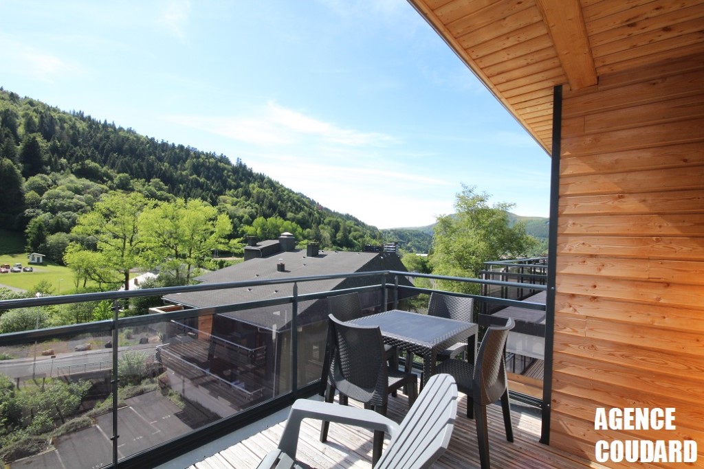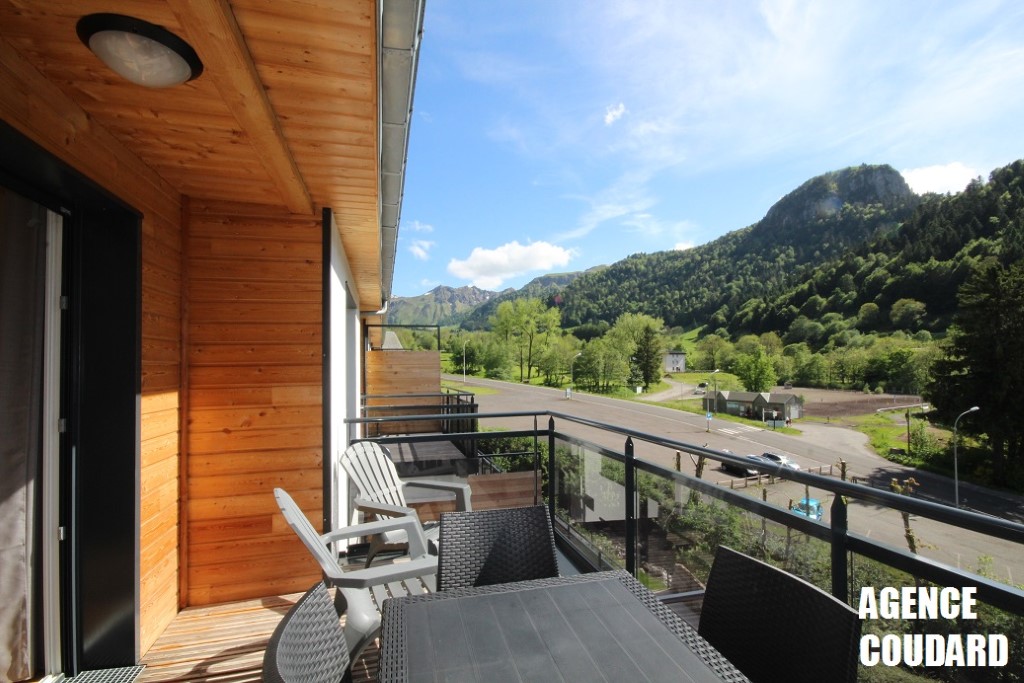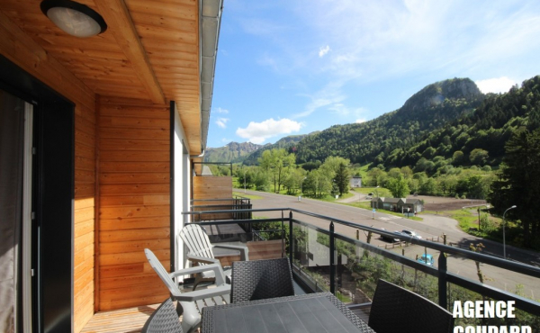 L'appartement se compose d'une entrée, une belle pièce à vivre combinant séjour (avec canapé convertible 2 couchages) et cuisine US / salle à manger, le tout exposé plein OUEST et ouvrant sur un agréable balcon, disposant d'une splendide vue sur le Sancy et le Capucin.