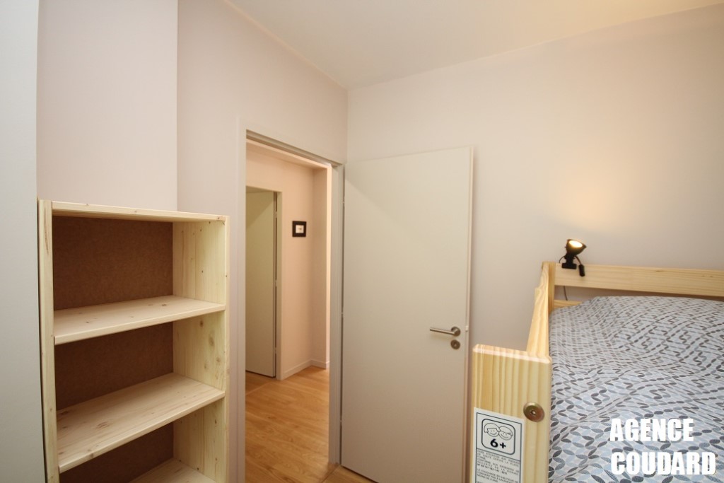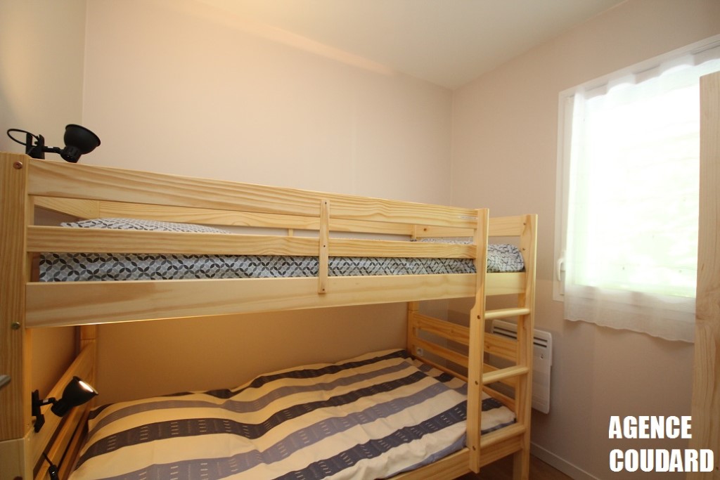 Toujours au même niveau, deux chambres : une grande avec un lit deux personnes et de nombreux rangements, et une seconde, plus petite avec deux lits une personne superposés.
