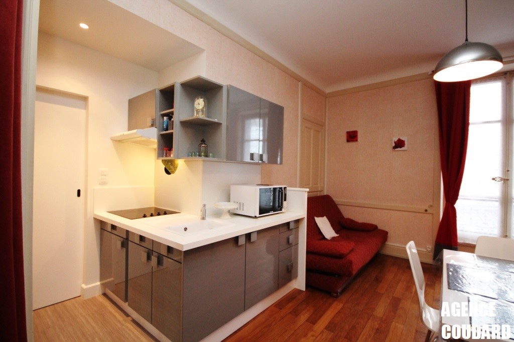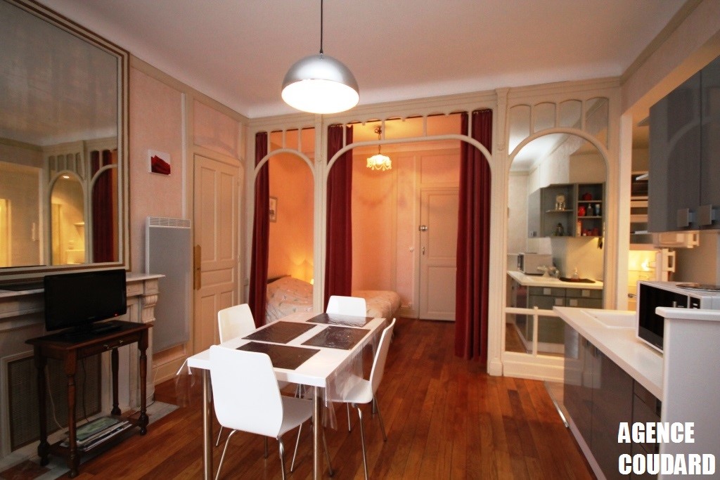 Belle pièce de vie parquet avec 1 banquette clic clac 2 personnes, télévision. Une cuisine US équipée, un espace nuit avec 1 lit 2 personnes.