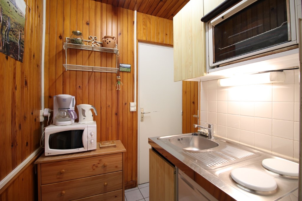 Ilse compose d'un séjour avec canapé clic-clac 2 personnes, une kitchnette équipée, une alcôve avec un lit 140 et un lit mezzanine 140,