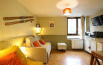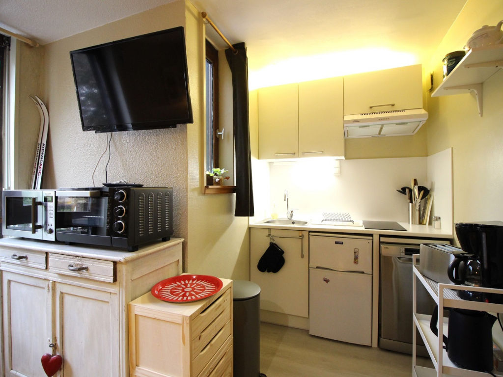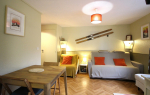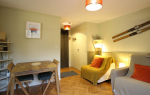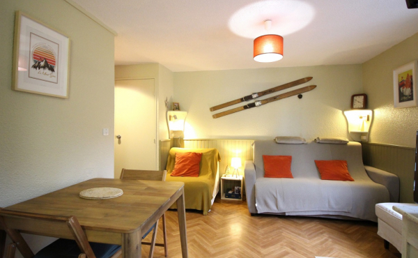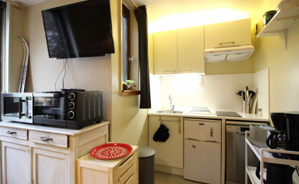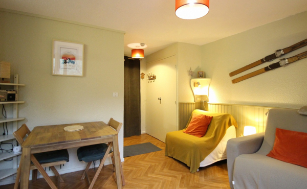 Ce studio est composé d'une entrée avec rangements, une piéce à vivre exposé Sud équipée d'un convertible en couchage double de type rapido et une chauffeuse convertible en couchage simple.