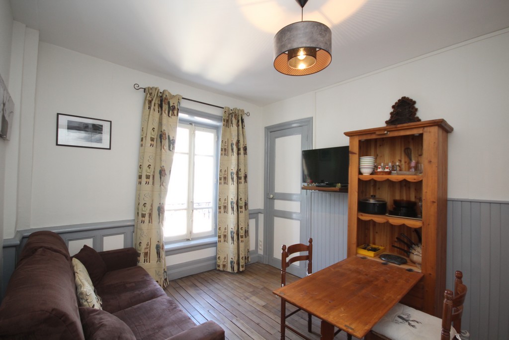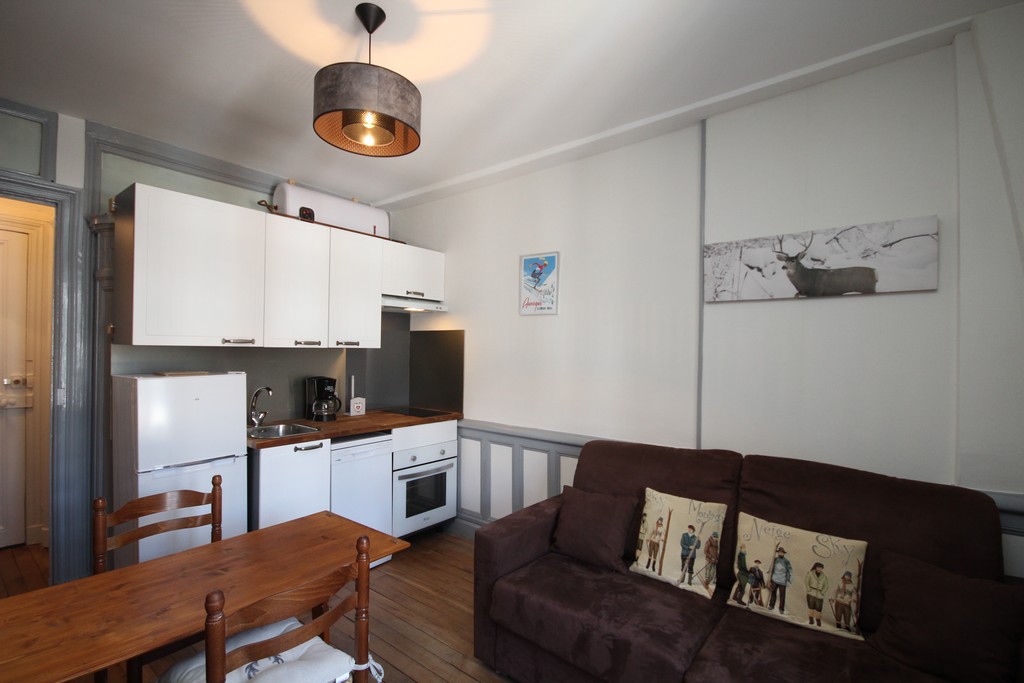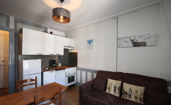 Il se compose d'une agréable pièce à vivre (avec canapé rapido deux personnes) et cuisine US équipée (notamment grand réfrigérateur, four, lave-vaisselle ...), le tout donnant au calme sur la cour intérieure de la Résidence.