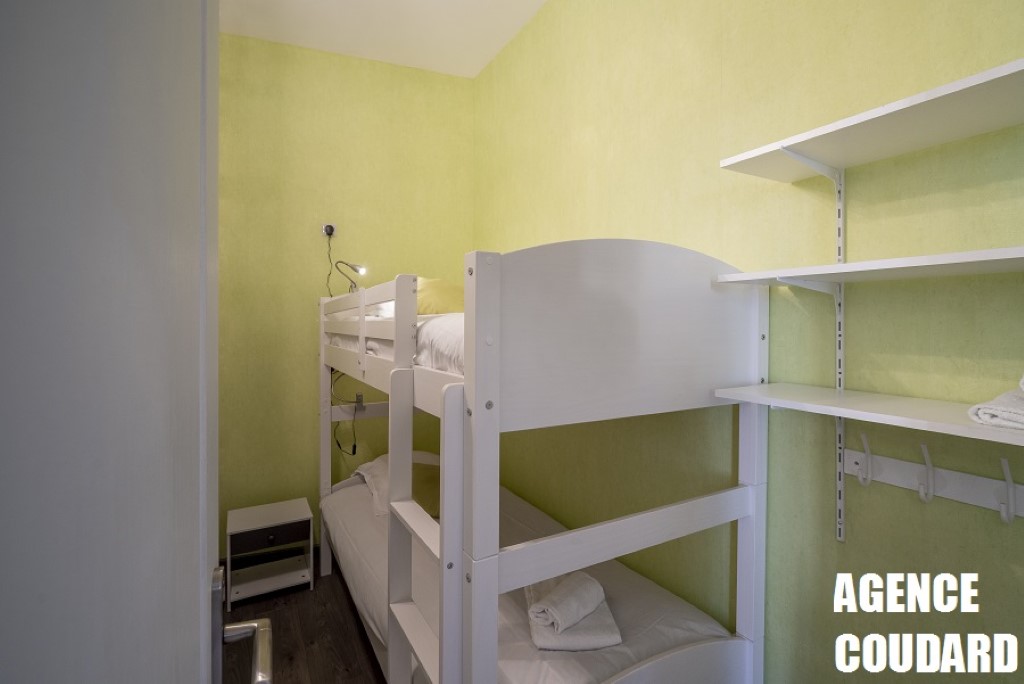 une grande chambre avec un lit deux personnes en 140, et une petite chambre cabine avec lits superposés (2 X 90).