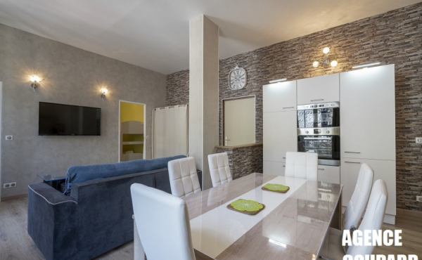 Il se compose d'une pièce à vivre comprenant un canapé convertible 2 personnes, une grande cuisine US entièrement équipée (grand réfrigérateur, four, lave linge, lave vaisselle ...)