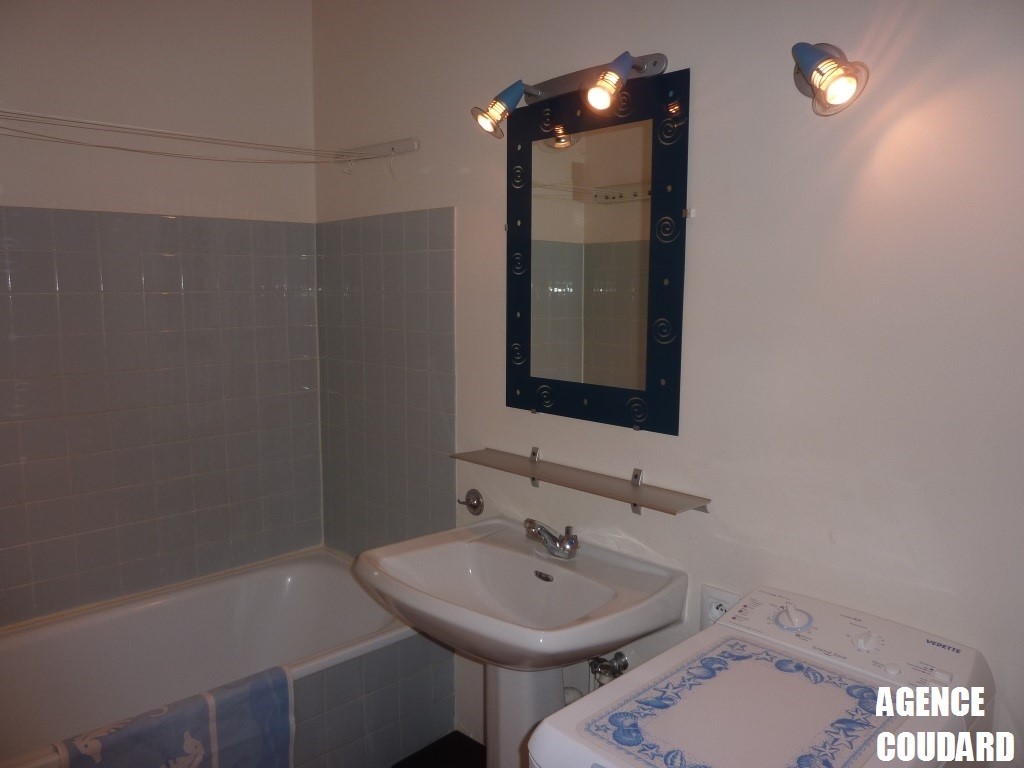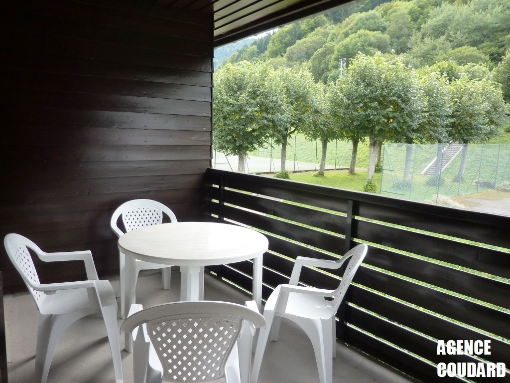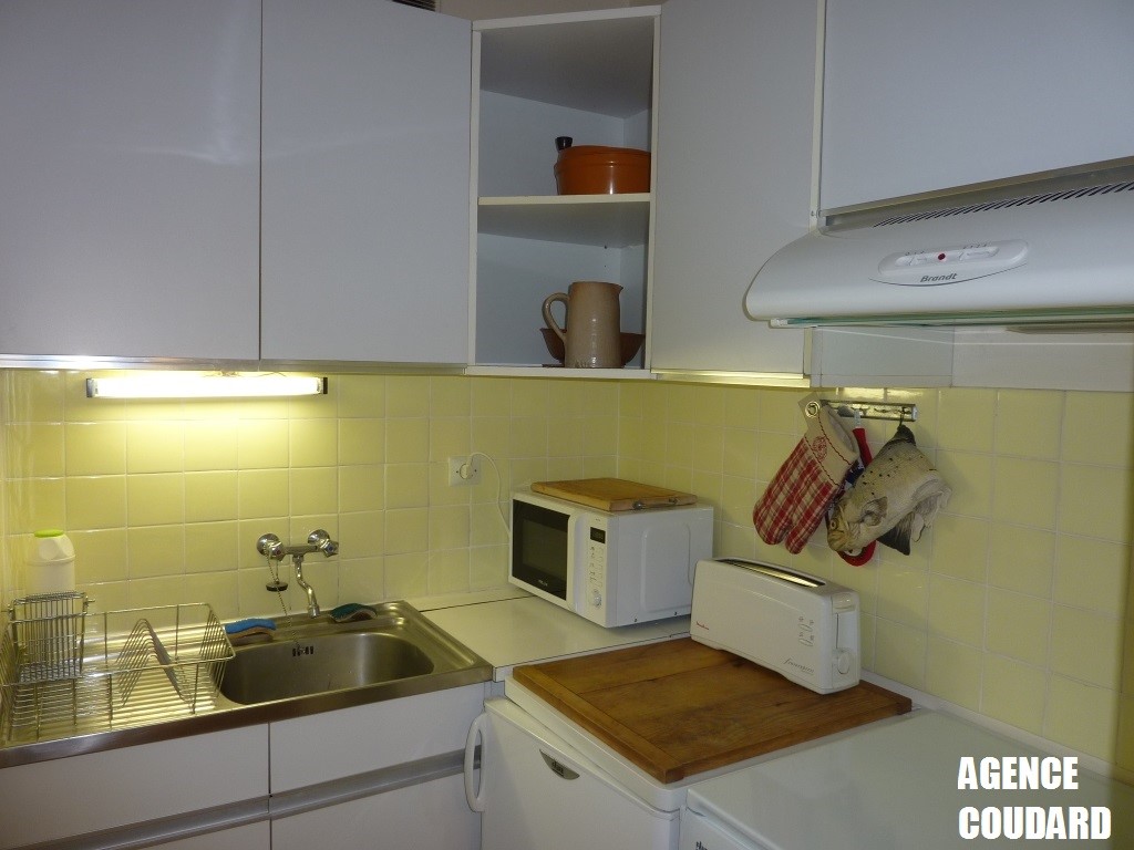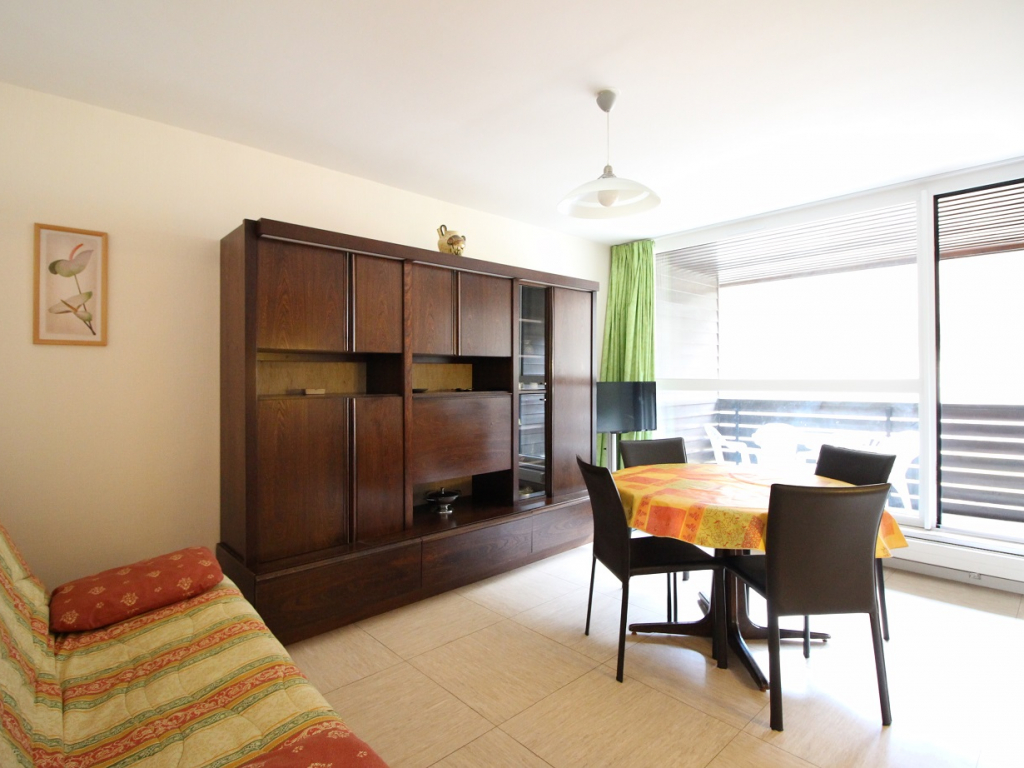 Hall d'entrée, séjour avec banquette clic clac 2 personnes ouvrant sur balcon, kitchenette équipée, une chambre avec 1 lit 2 personnes, salle de bains (baignoire) avec WC - lave linge.
