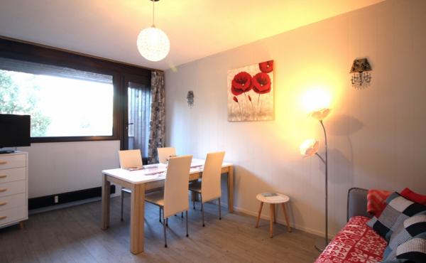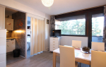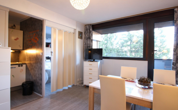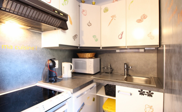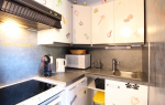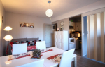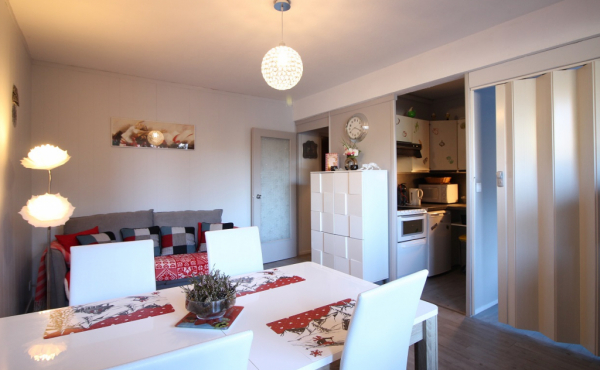 Pièce à vivre avec un canapé rapido en 140, kitchenette équipée avec combiné Rosières four, lave-vaisselle et plaque 4 zones vitrocéramique, hotte, micro-ondes, réfrigérateur Top + freezer,