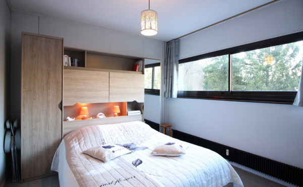 une chambre avec un lit 2 personnes en 140 fermée avec une porte accordéon