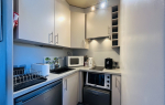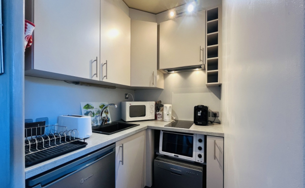 Une petite cuisine équipée avec réfrigérateur, micro-ondes, mini-four, lave-vaisselle ....,