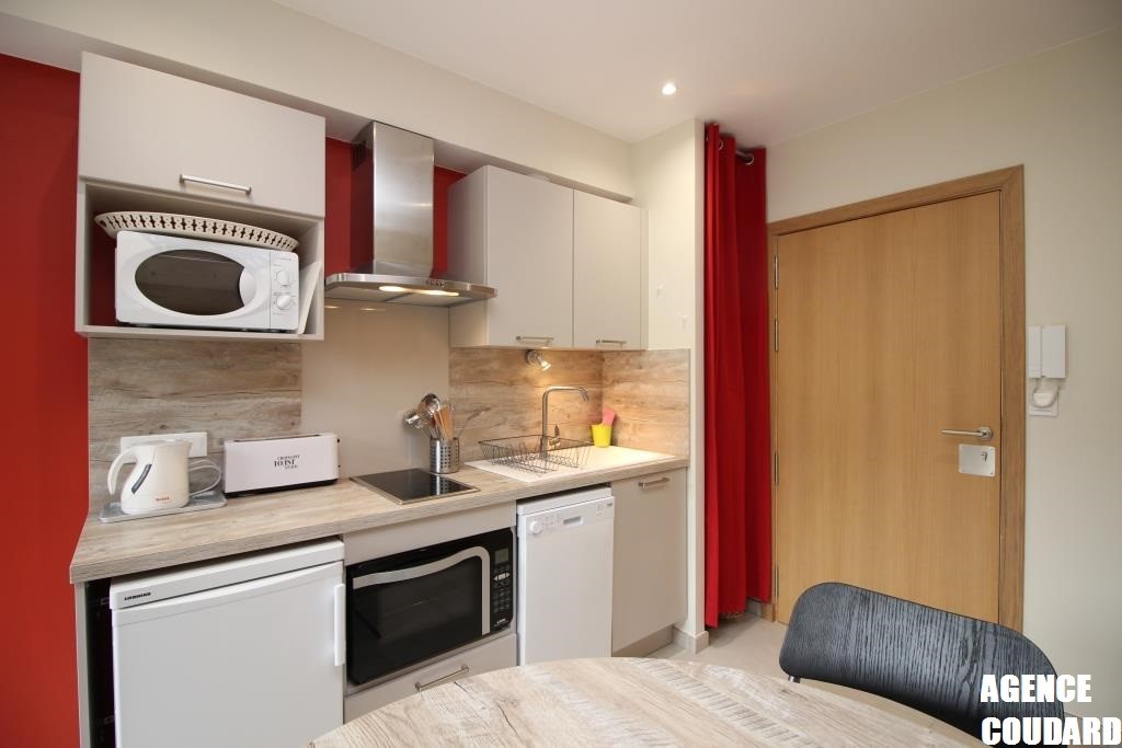 cuisine US totalement équipée avec plaque induction, four, micro-ondes, lave-vaisselle, réfrigérateur Top