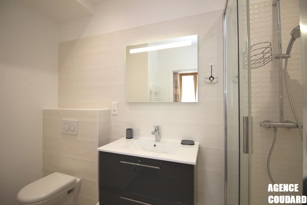 Une chambre lit 160, rangements et salle d'eau/wc (grande douche) avec sèche serviettes et lave-linge.
