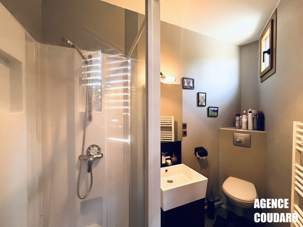 Mais encore et toujours au premier niveau, la maison dispose d'un dégagement aménagé en coin nuit et d'une salle d'eau avec douche et WC.