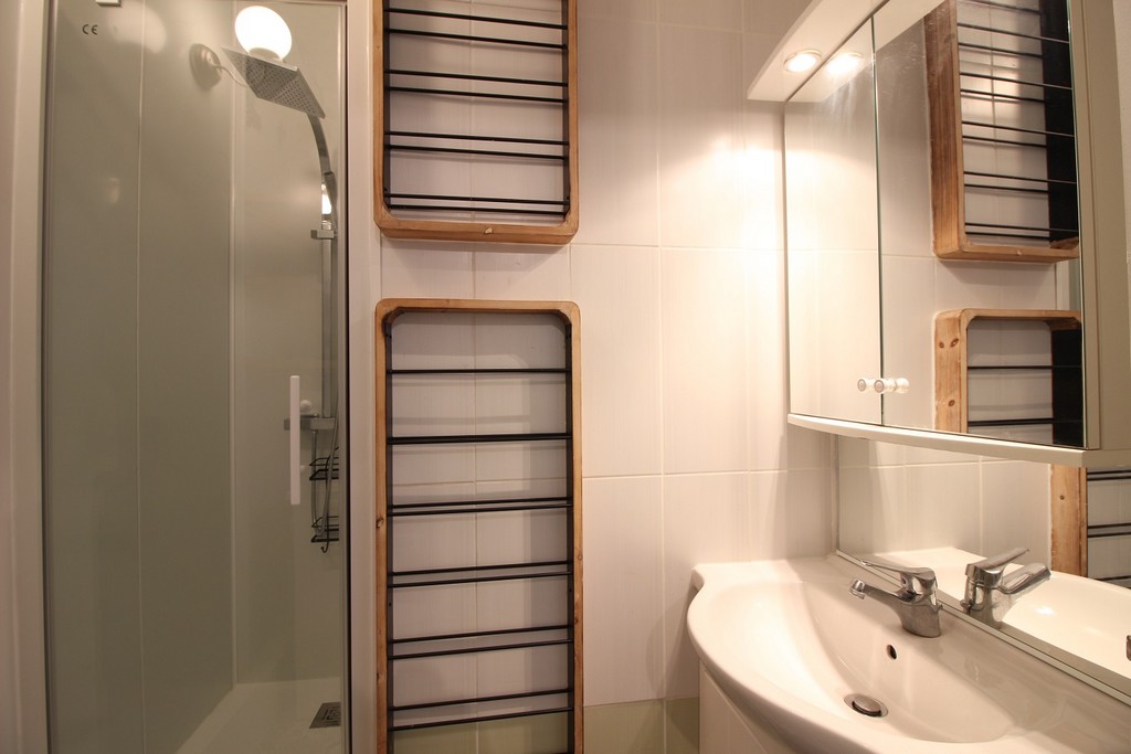 Une salle d'eau (douche) sèche-serviettes et lave-linge séchant,