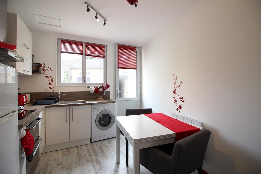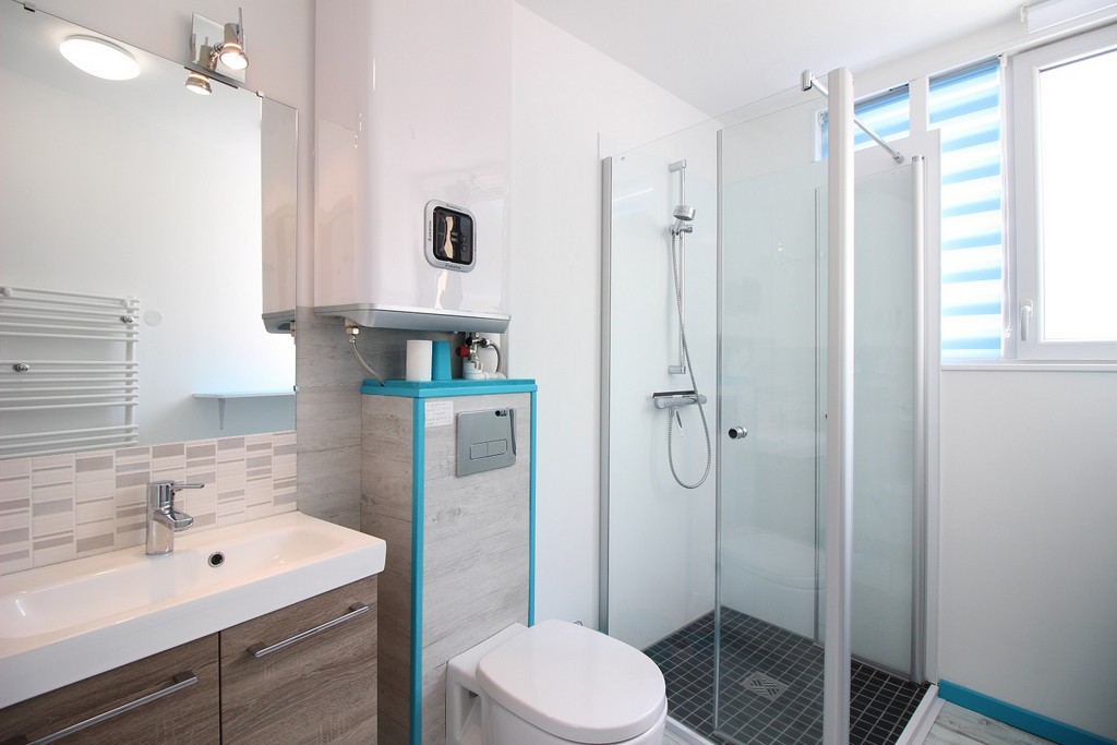 Salle d'eau (douche) avec wc, sèche-serviettes et lave-linge.