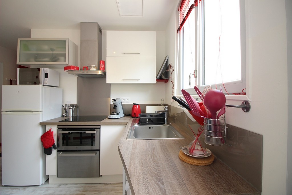 Cuisine US équipée avec plaque induction 3 zones, hotte, micro-ondes, four, petit lave-vaisselle, réfrigérateur grand modèle avec congélateur ...