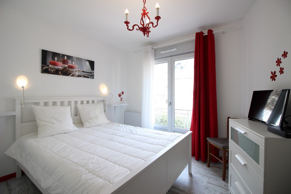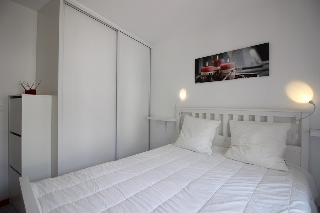 Une chambre lit 160x200, rangements et télévision, ouvrant sur balcon