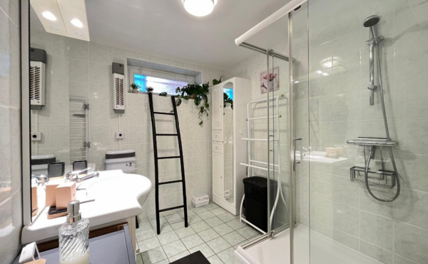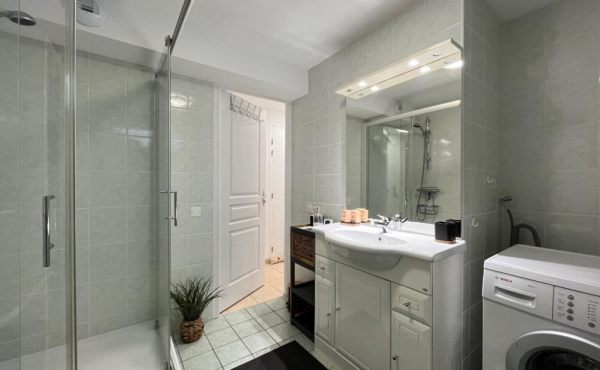 Salle d'eau (douche) avec séche-serviettes et lave-linge.