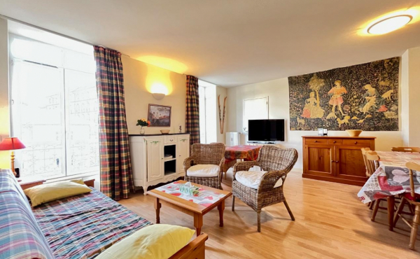 Cet appartement est composé d'une spacieuse pièce à vivre avec convertible couchage1 personne, cuisine US équipée: réfrigérateur GM avec congélateur, combiné plaque vitro céramique et four, lave-linge séchant, lave-vaisselle, micro-ondes ...