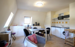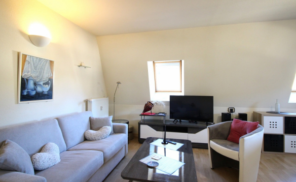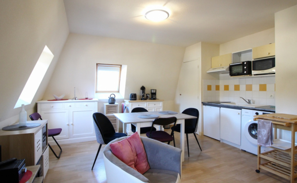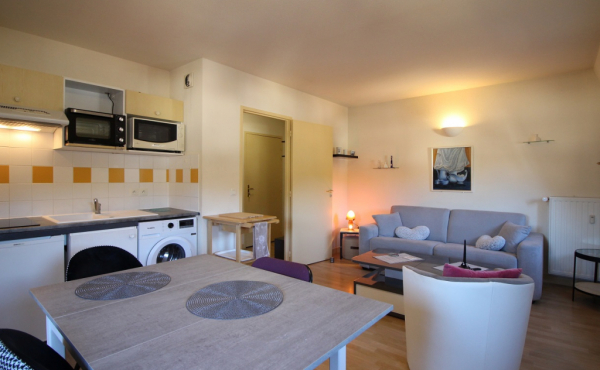 Cet appartement est composé d'une entrée, une piéce à vivre équipée d'un canapé convertible en couchage 2 personnes, une cuisine US totalement équipée avec plaque vitrocéramique 2 zones, hotte, mini-four, micro-ondes, réfrigérateur Top ...