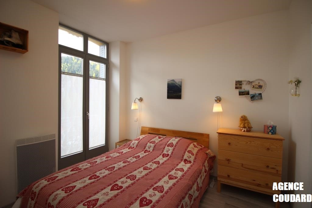 Une seconde chambre avec un lit 140 en mezzanine éclairée par une porte fenêtre.