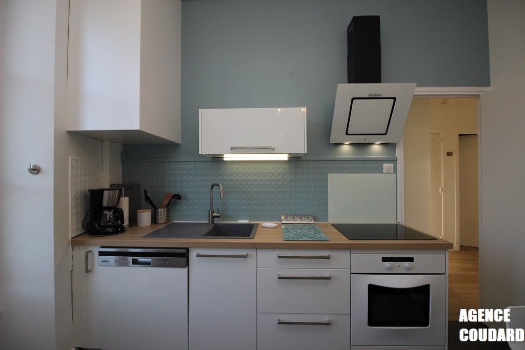 une cuisine séparée entièrement équipée (lave-vaisselle, plaque induction, réfrigérateur grand modèle avec compartiment congélateur, four, micro-ondes, hotte...) avec coin repas, profitant également d'une exposition d'angle et d'une porte fenêtre ouvrant sur un petit balcon filant.