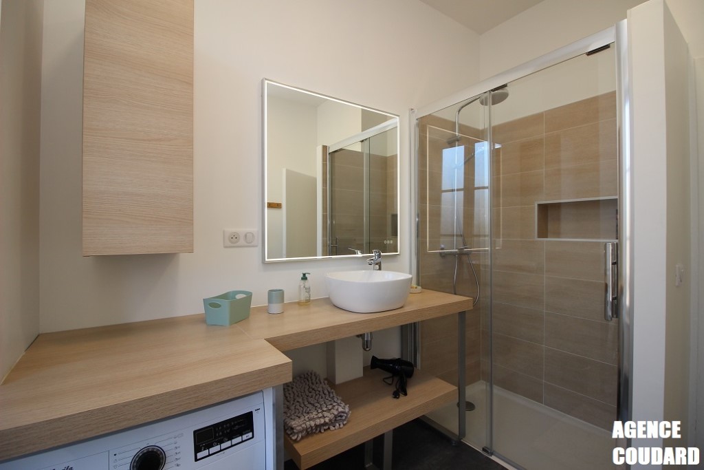 une belle salle d'eau (douche) dotée d'un grand plan de toilette, sèche-serviettes et lave-linge,