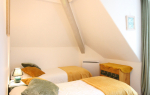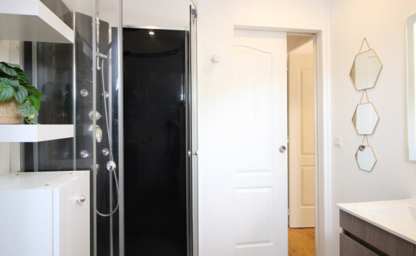 Une salle d'eau (douche) avec séche-serviettes, lave-linge et coin wc.