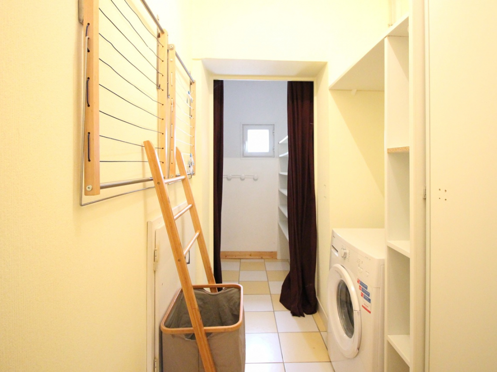 Un espace buanderie avec lave-linge et étendoirs.