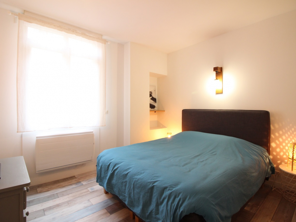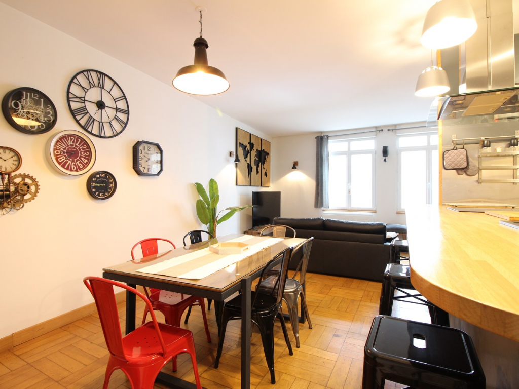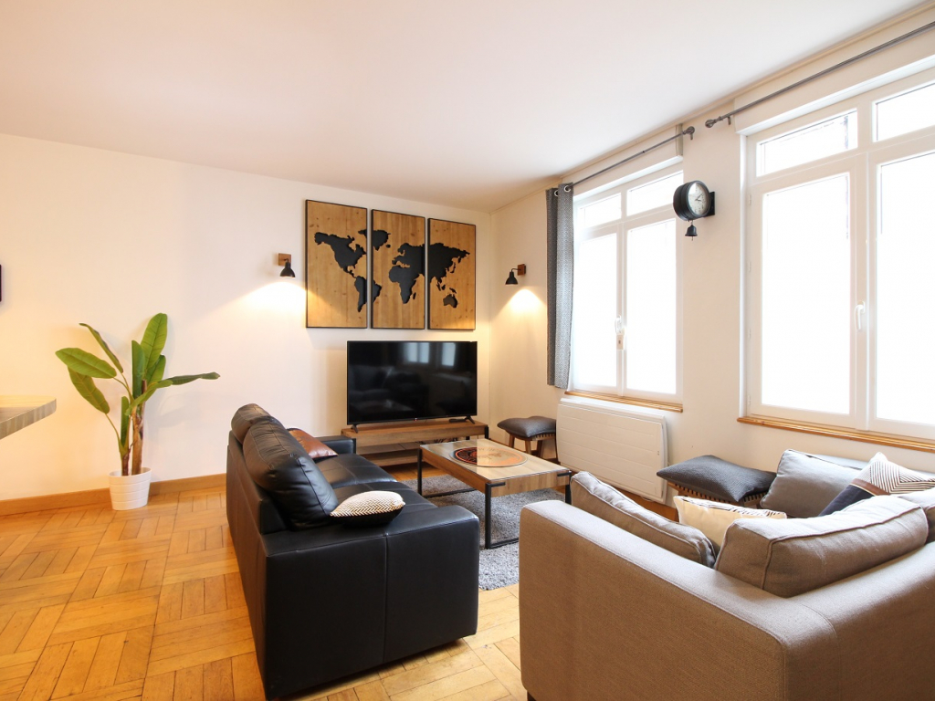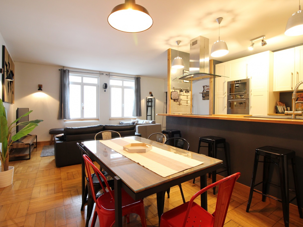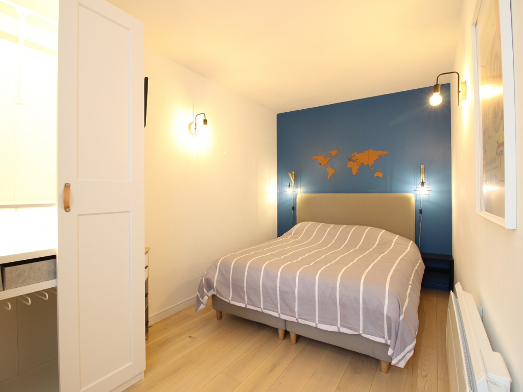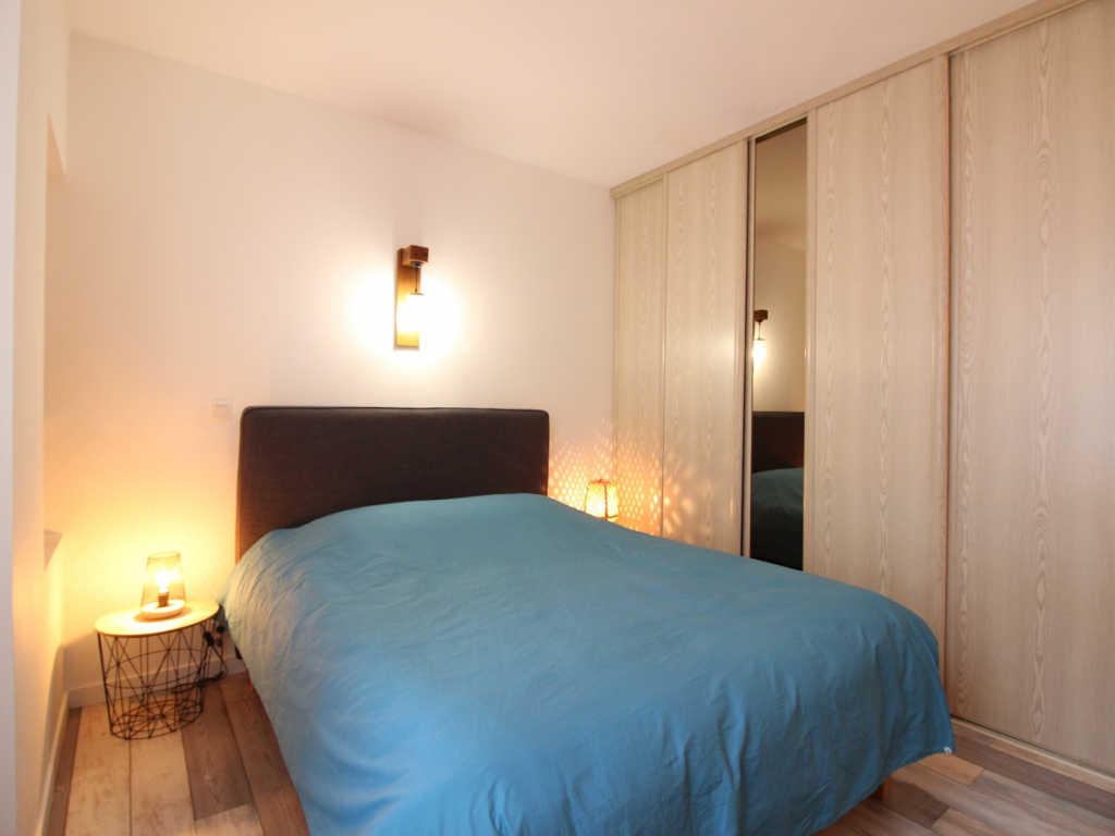 Cet appartement comprend un vaste espace à vivre exposé ouest avec salon équipé d'un convertible en couchage 2 personnes, une cuisine US totalement équipée avec plaque induction 3 zones, hotte, four, lave-vaisselle, micro-ondes, réfrigérateur grand modèle avec congélateur ...
