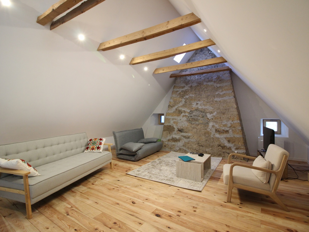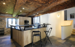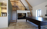 un espaces repas avec poêle à bois, une cuisine US totalement équipée avec table induction 4 zones intégrant un systéme d'aspiration, four, micro-ondes, réfrigérateur/congélateur, lave-vaisselle ... Un séjour équipé d'un billard français. En mezzanine, un espace salon avec canapé convertible en couchage 2 personnes 217x150.