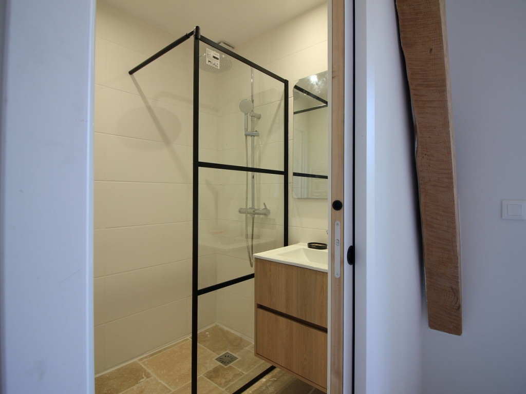 En rez de chaussée : une chambre lit 160x200, rangements et salle d'eau privative.