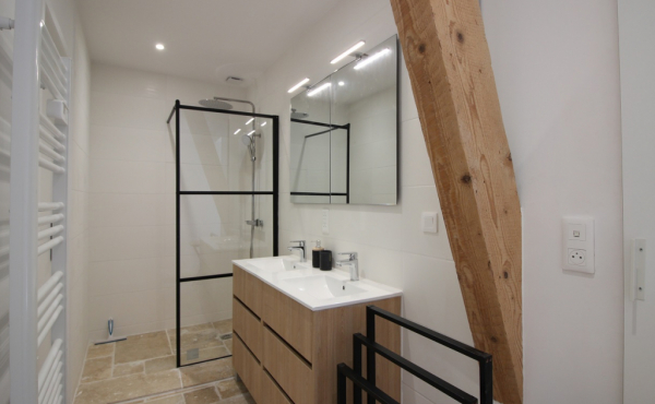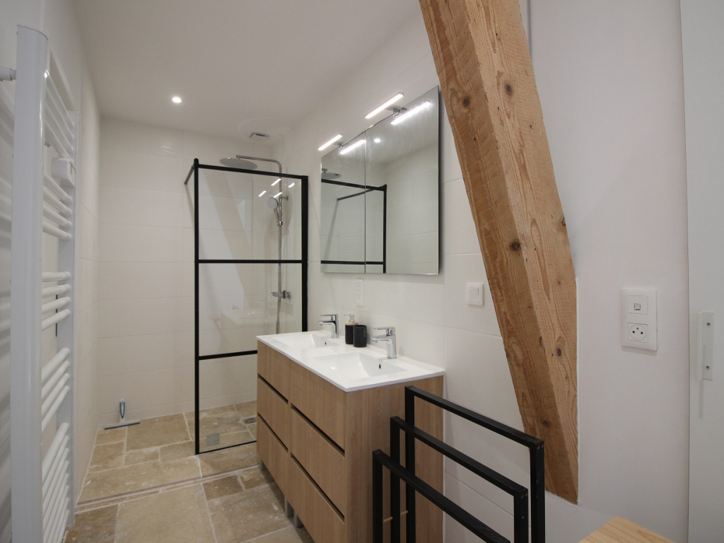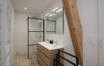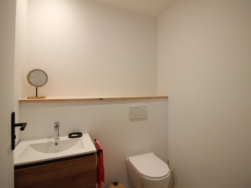 Une salle d'eau (douche) équipée d'un séche-serviettes, deux toilettes indépendants, un espace banderie avec lave-linge et séche-linge.