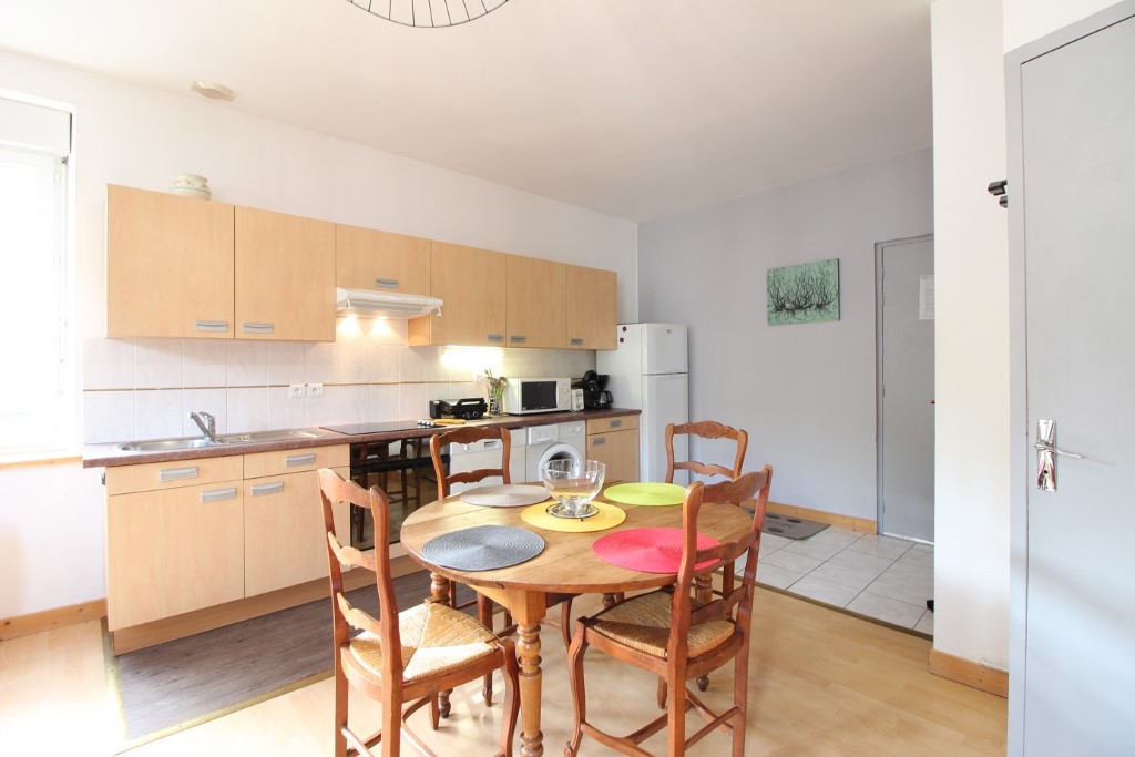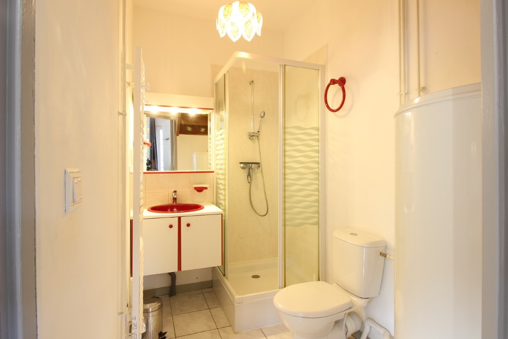Il se compose au premier niveau, d'une pièce à vivre combinant séjour, cuisine US et salle à manger, le tout exposé EST et bénéficiant d'une vue dégagée sur la ville. Cette première pièce dispose d'un canapé convertible en lit deux personnes. Toujours au même niveau, une salle d'eau avec douche et WC.