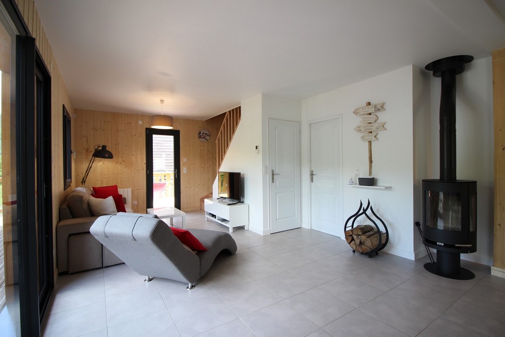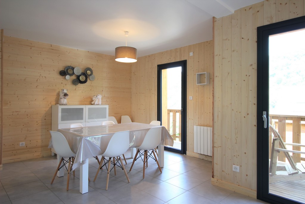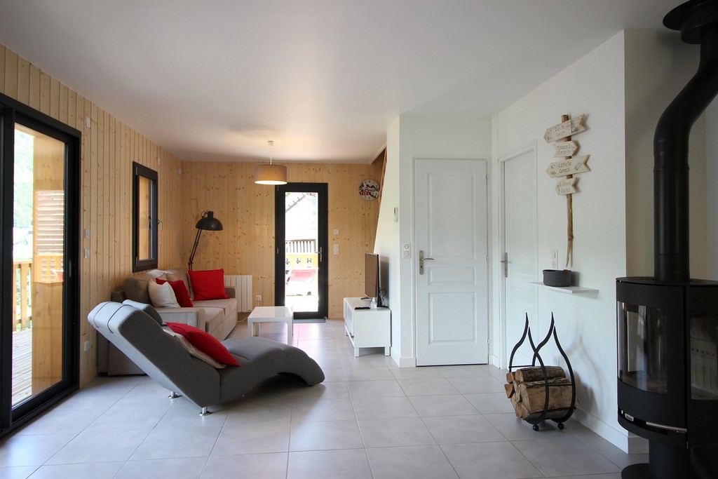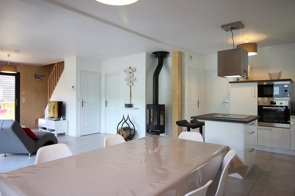 Ce chalet est composé au 1er niveau d'une spacieuse et agréable pièce à vivre équipée d'un poêle à bois, combinant salon, espace repas et cuisine US totalement équipée avec plaque vitrocéramique 3 zones, hotte, four, micro-ondes, réfrigérateur grand modèle, lave-vaisselle...