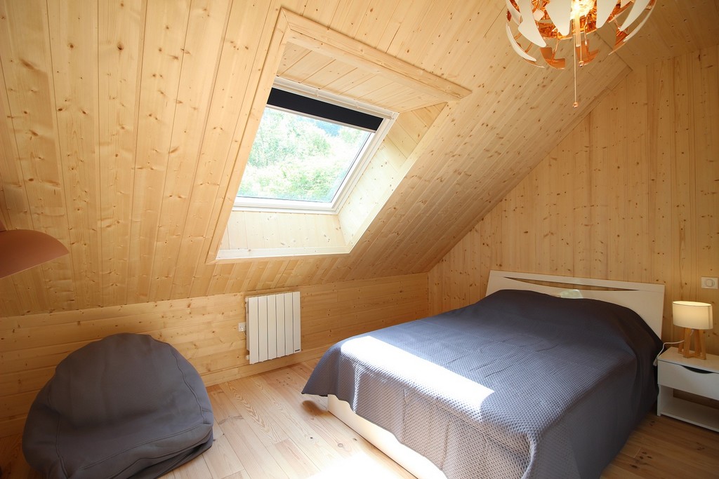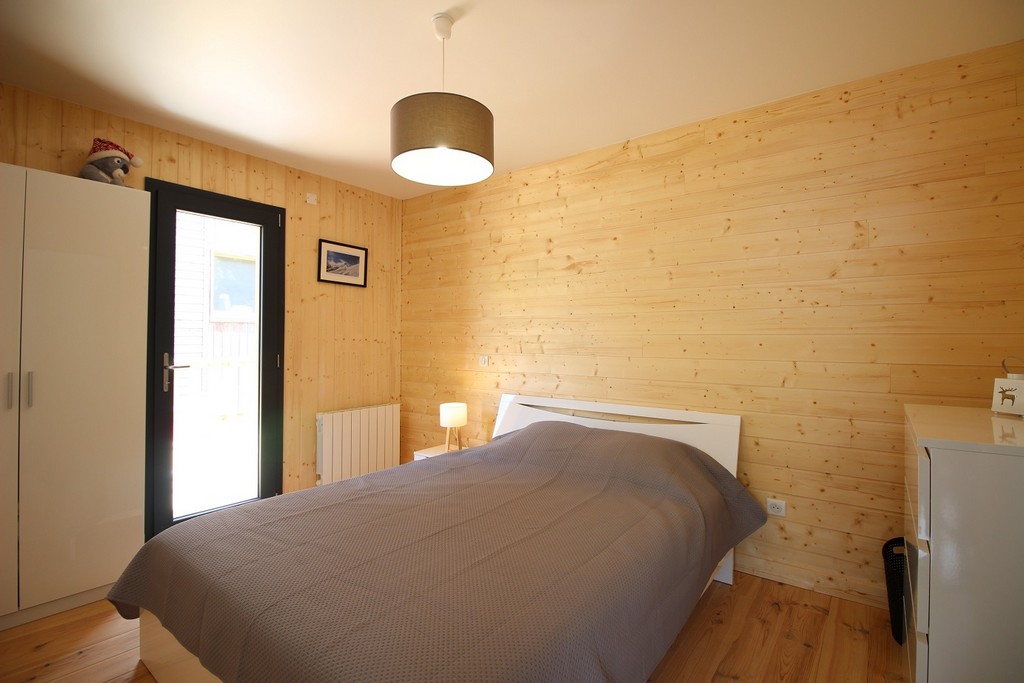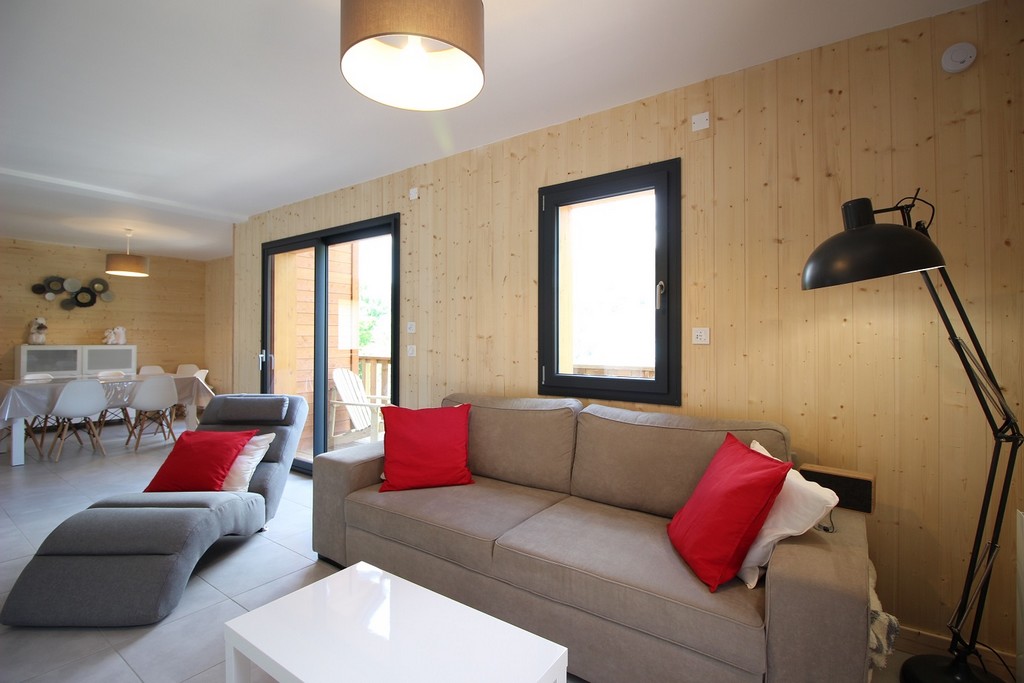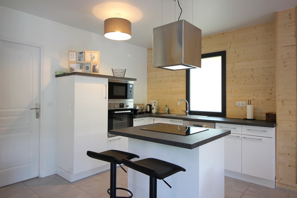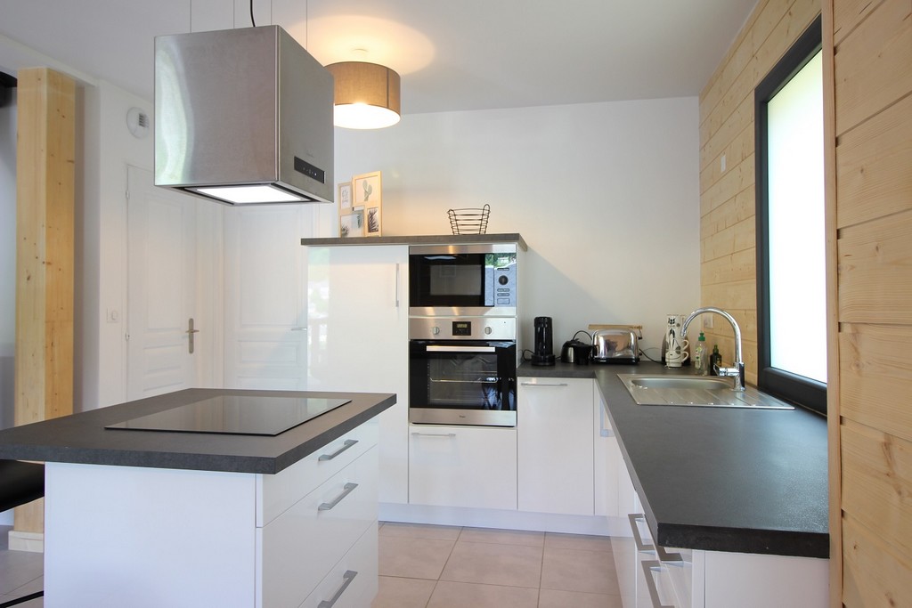 Ce chalet est composé au 1er niveau d'une spacieuse et agréable pièce à vivre équipée d'un poêle à bois, combinant salon, espace repas et cuisine US totalement équipée avec plaque vitrocéramique 3 zones, hotte, four, micro-ondes, réfrigérateur grand modèle, lave-vaisselle...