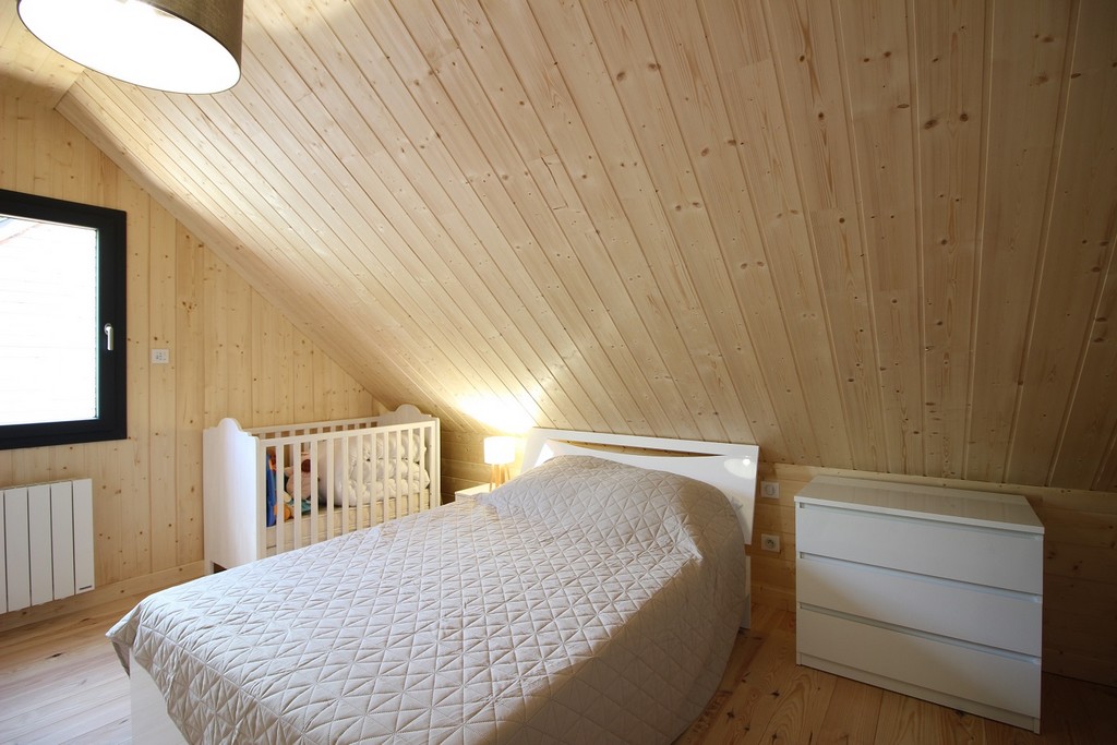 Une chambre lit 140 équipée d'un lit bébé en bois et lit parapluie.