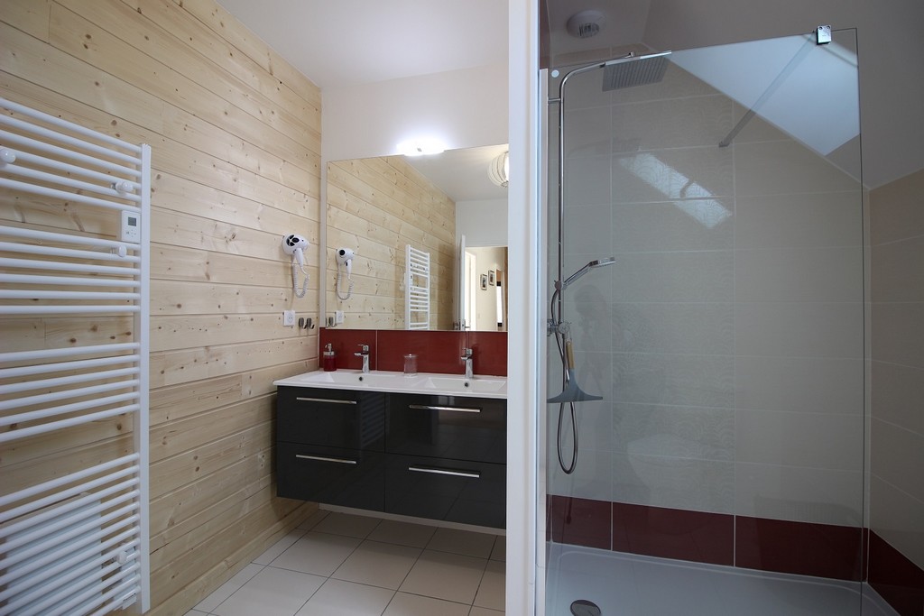 Une spacieuse salle d'eau avec grande douche, double vasque, sèche serviettes et WC.