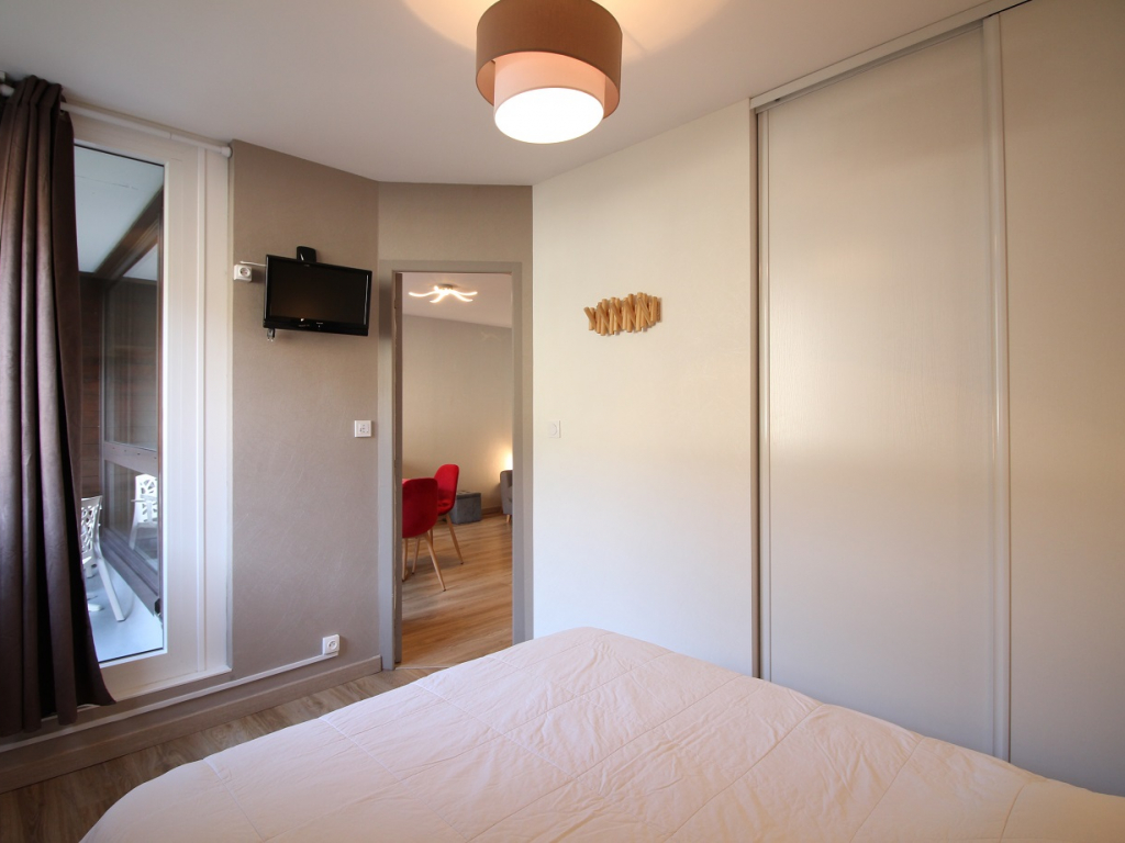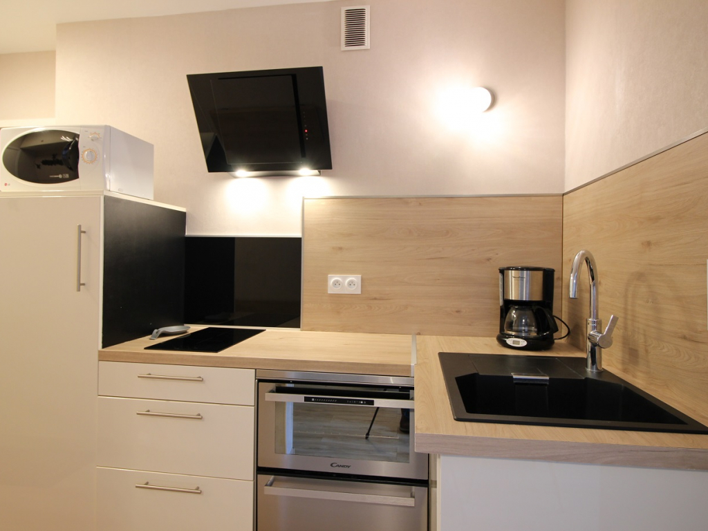 Il se compose d'une agréable pièce à vivre ouvrant sur balcon Est équipée d'un convertible en couchage 2 personnes de type Rapido, une cuisine US totalement équipée avec plaque vitrocéramique deux zones, hotte, four, micro-ondes, réfrigérateur grand modèle avec espace congélateur.