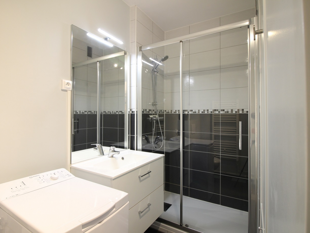 une chambre lit 140 avec rangements et télévision, salle d'eau / wc (douche) avec lave-linge et séche-serviettes